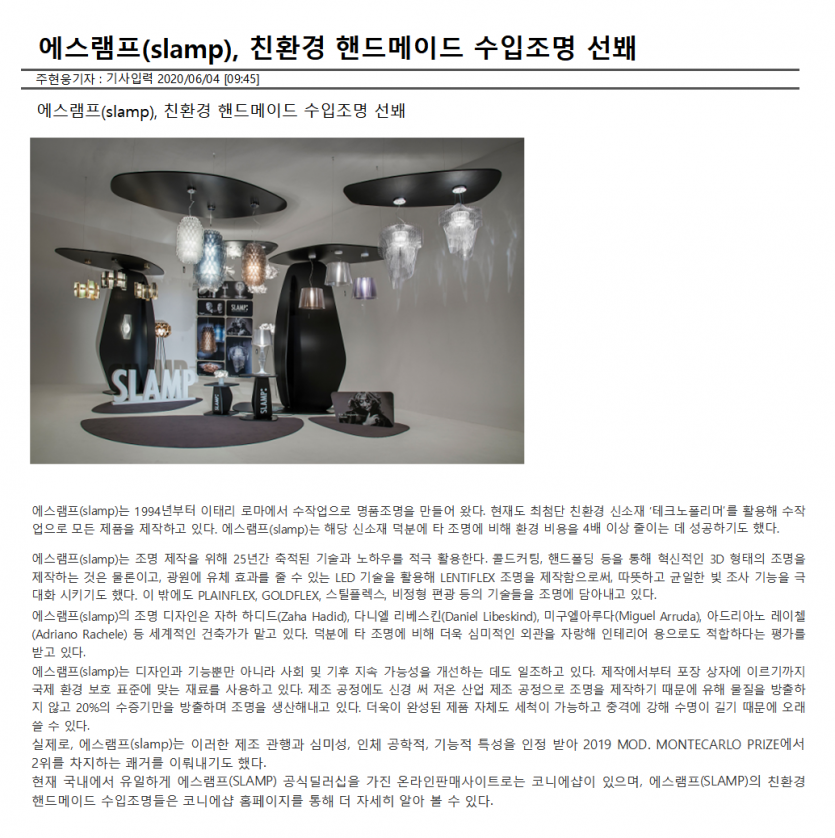 에스램프(slamp), 친환경 핸드메이드 수입조명 선봬